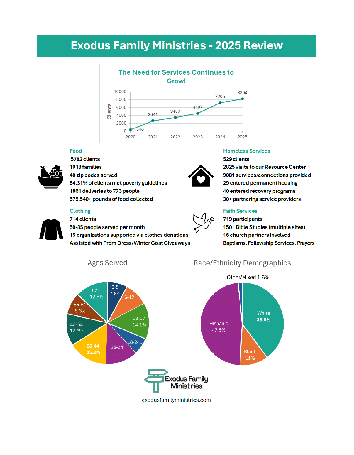 The Exodus Community Resource Center helps to connect unsheltered neighbors in Southwest Louisville with basic needs (food, clothing and hygiene) and community resources (partners who can help them secure: forms of identification, healthcare, recovery programs, housing assistance, grief/trauma counseling, and more). More than 500 unique individuals were served last year. We were able to help 29 get into permanent affordable housing and 40 enter addiction recovery programs.